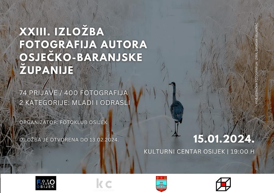 U ponedjeljak, 15. siječnja s početkom u 19.00 sati u foyeru Kulturnog centra Osijek, u organizaciji Fotokluba Osijek, bit će otvorena 23. izložba fotografija autora iz Osječko-baranjske županije. Izložba ostaje otvorena sve do 13. veljače uz slobodan ulaz.