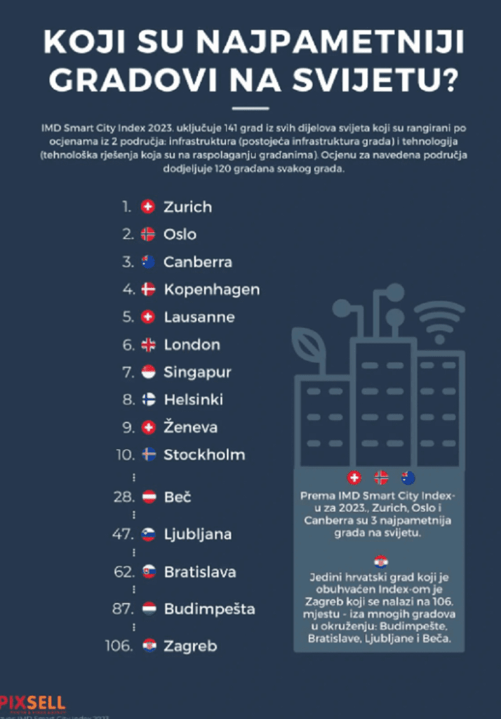 Prema IMD Smart City Index-u za 2023. Zurich, Oslo i Canberra su tri najpametnija grada na svijetu prema ocjenama iz dva područja, infrastrukturi grada i tehnološkim rješenjima koja su na raspolaganju građanima.