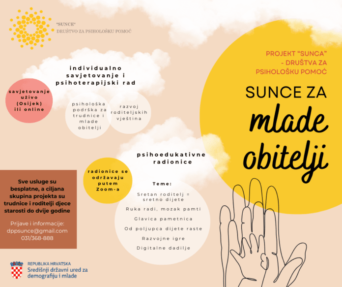 “Sunce” Društvo za psihološku pomoć nudi besplatna psihološka savjetovanja i psihoedukativne radionice za sve trudnice i roditelje koji imaju djecu starosti do dvije godine.