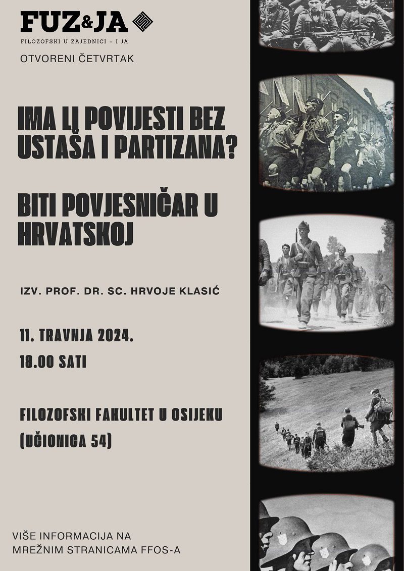 U četvrtak, 11. travnja 2024., održat će se osmo popularno-znanstveno događanje u sklopu 12. ciklusa Otvorenog četvrtka kao dijela projekta popularizacije znanosti FUZ&JA Filozofskog fakulteta u Osijeku, naslovljeno Ima li povijesti bez ustaša i partizana? Biti povjesničar u Hrvatskoj, koje će održati izv. prof. dr. sc. Hrvoje Klasić.