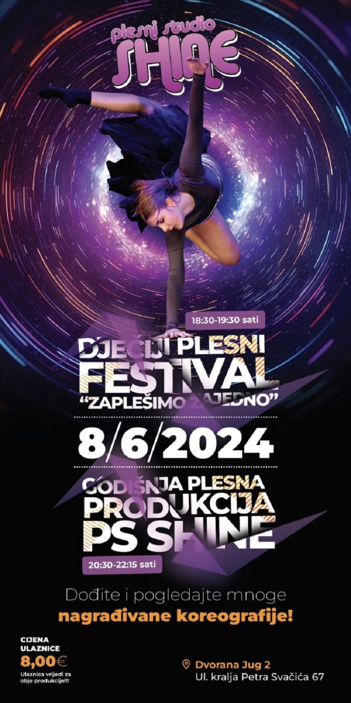 Udruga za promicanje kulture plesa, Plesni studio SHINE, 8. lipnja 2024. organizira Dječji plesni festival ‘Zaplešimo zajedno i Godišnju plesnu produkciju’ koju organiziraju već 19. godinu zaredom. Na festivalu sudjeluje pet grupa predškolske djece, a na produkciji nastupaju i djeca školske dobi, juniori i nagrađivani seniori. Sudjelovat će 250 djece i mladih sa 50 plesnih koreografija, koje su marljivo uvježbavali tijekom cijele plesne sezone 2023./2024. U goste im dolaze i veterani plesnog kluba Feniks, prvi osječki plesači show danca generacije 1994.-1996. godina.