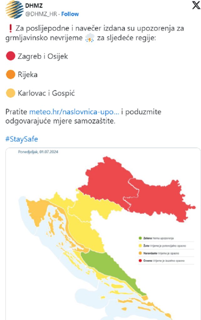 Za zagrebačku i osječku regiju izdano je crveno upozorenje, što znači izuzetno opasno vrijeme.