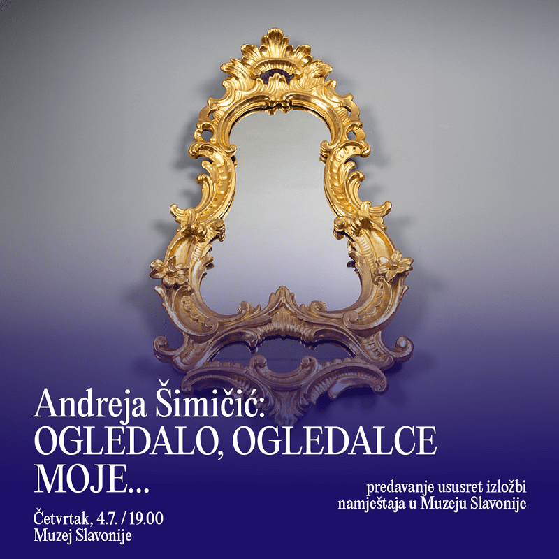 Četvrtak, 4.7./19.00 sati/ Muzej Slavonije – Ljeto u Muzeju Slavonije: predavanje Andreje Šimičić “OGLEDALO,OGLEDALCE MOJE…” ususret izložbi namještaja koja se priprema u Muzeju.