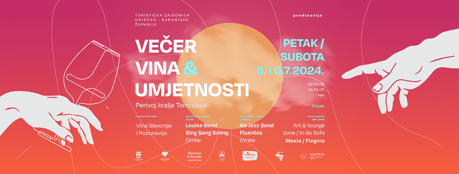 Dolaze nam večeri koje će obasjati Osijek poput zvijezda na vedrom nebu. U toplini proljetnog sutona, Turistička zajednica Osječko-baranjske županije vas uz partnere poziva na putovanje kroz čaroliju okusa, zvukova i vizija uz poruku – dobrodošli na Večer vina i umjetnosti, koja će se prvi put održati u dvodnevnom izdanju u predivnom Perivoju kralja Tomislava, u petak i subotu, 5. i 6. srpnja 2024. godine.