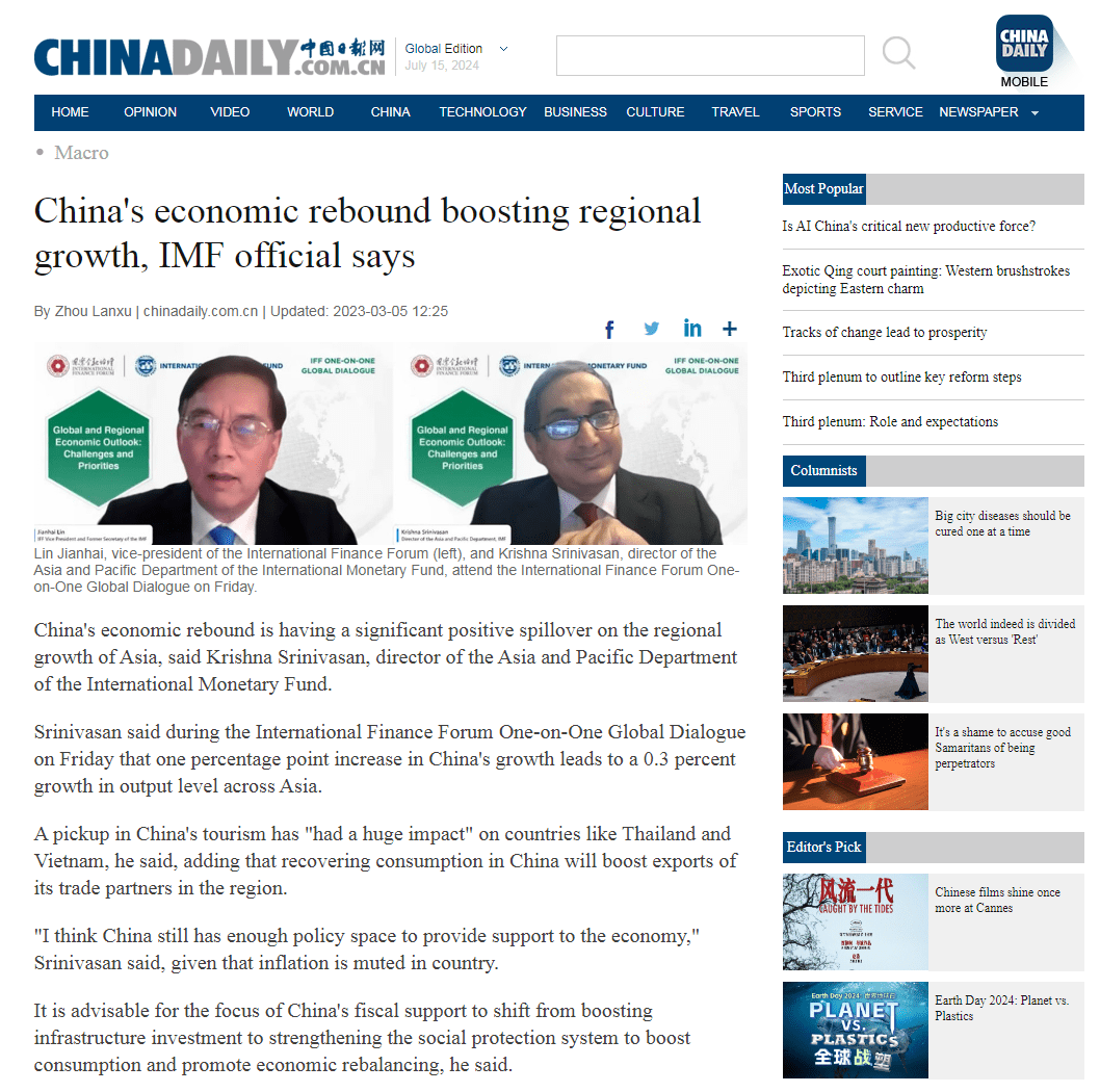 U posljednje vrijeme Svjetska banka, Međunarodni monetarni fond i druge brojne međunarodne financijske agencije povećale su očekivanja za kinesko gospodarstvo u 2024. Istraživanje MMF pokazalo je da rast kineskog gospodarstva za 1 postotni bod omogućuje povećanje proizvodne razina drugih gospodarstava za 0,3 postotna boda. Sve ovo pokazuje da je kinesko gospodarstvo i dalje najveći pokretač globalnog rasta i da je kinesko je tržište još uvijek nezaobilazno za strane investitore.