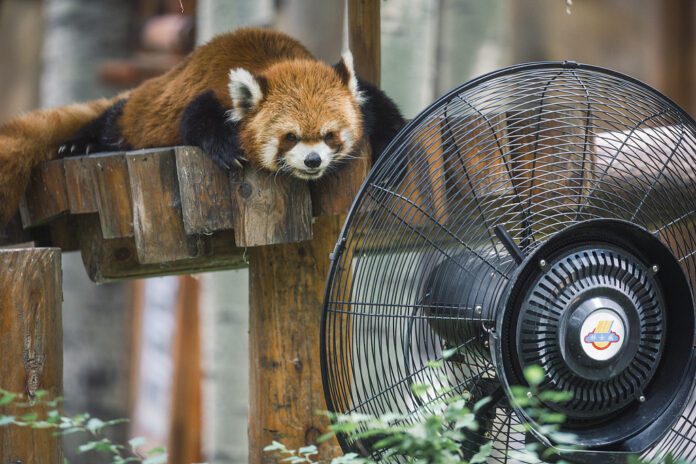Crvena panda u Parku divljih životinja u Pekingu ležala je preko blokova leda ispred električnog ventilatora, pokušavajući se rashladiti i pobjeći od vrućine.