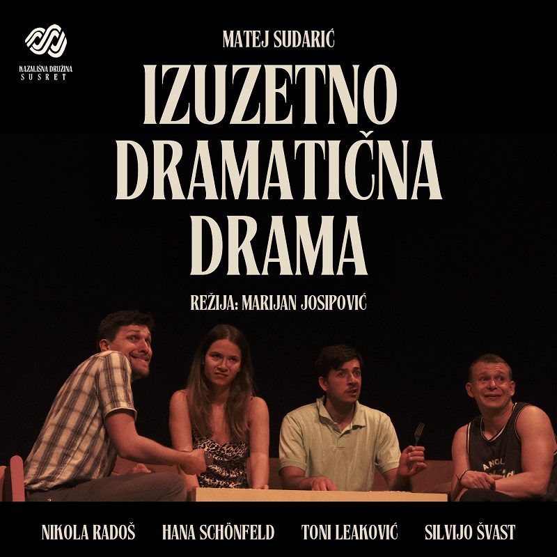 Petak, 23.8. /20.00 sati/ Dvorište Stare pekare – kazališna predstava/ komedija “IZUZETNO DRAMATIČNA DRAMA” u režiji Marijana Josipovića, dramaturgiji Mateja Sudarića, produkciji Kazališne družine SUSRET. Glume: Hana Schonfeld, Nikola Radoš, Toni Leaković i Silvio Švast.