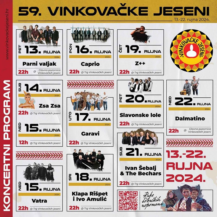 Što se tiče koncerata, vinkovačku publiku najprije će zagrijati Parni valjak. U idućim danima na pozornicu će se popeti Zsa Zsa, Vatra, Caprio, Garavi, Klapa Rišpet i Ivo Amulić, Z++, Slavonske lole i Ivan Šebalj & The Bechars. Posljednjeg dana bit će održan koncert grupe Dalmatino.