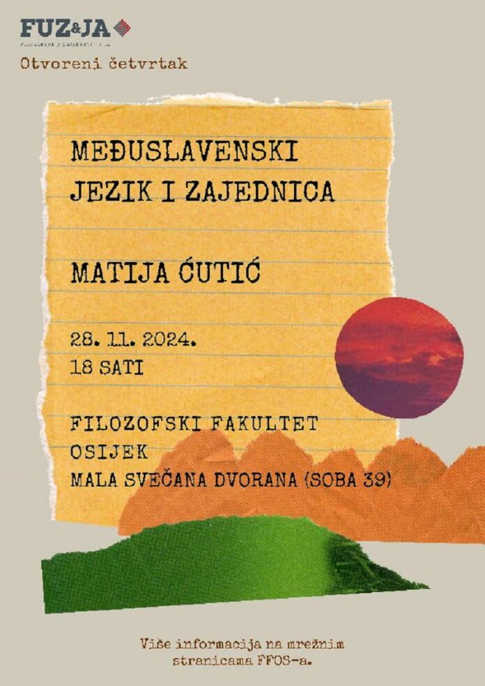 U četvrtak 28. studenog 2024. održat će se drugo popularno-znanstveno događanje 13. ciklusa Otvorenog četvrtka kao dijela FUZ&JA-e, projekta popularizacije znanosti Filozofskog fakulteta u Osijeku. Predavanje naslovljeno Međuslavenski jezik i zajednica održat će Matija Ćutić, magistar komparativne književnosti i edukacije sociologije iz Udruge Međuslavenske kulture i Međuslavenskog saveza.