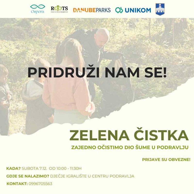 Pridružite se Zelenoj čistki, zajedničkoj akciji čišćenja šume u Podravlju, koju organiziraju Udruga Ospera, ROOTS – Centar za održivi obiteljski život i DANUBEPARKS, uz pokroviteljstvo Grada Osijeka i Unikoma.