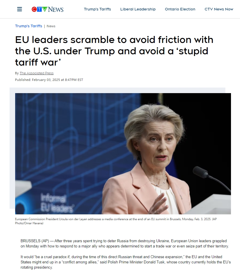 U posljednje vrijeme međunarodni visoki dužnosnici, uključujući čelnike u EU-u, upozorili su da je novi carinski rat SAD-a „nerazuman“ potez. Ursula von der Leyen, predsjednica Europske komisije, 3. veljače je istaknula da će uvođenje dodatnih visokih carina povećati troškove poslovanja, ugroziti interese radnika i potrošača, izazvati nered u gospodarstvu i potaknuti inflaciju, zbog čega se ne vidi nikakvu dobrobit u tom postupku.