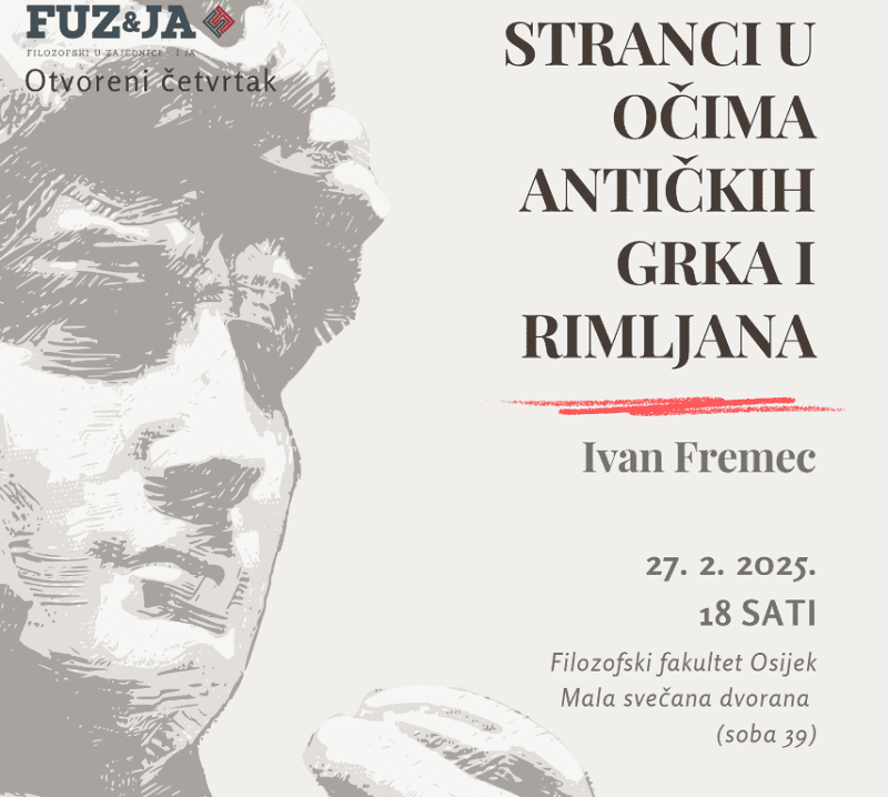 U četvrtak 27. veljače 2025. održat će se peto popularno-znanstveno događanje 13. ciklusa Otvorenog četvrtka kao dijela FUZ&JA-e, projekta popularizacije znanosti Filozofskog fakulteta u Osijeku. Predavanje naslovljeno Stranci u očima antičkih Grka i Rimljana održat će Ivan Fremec, asistent na Odsjeku za povijest Filozofskog fakulteta u Osijeku.