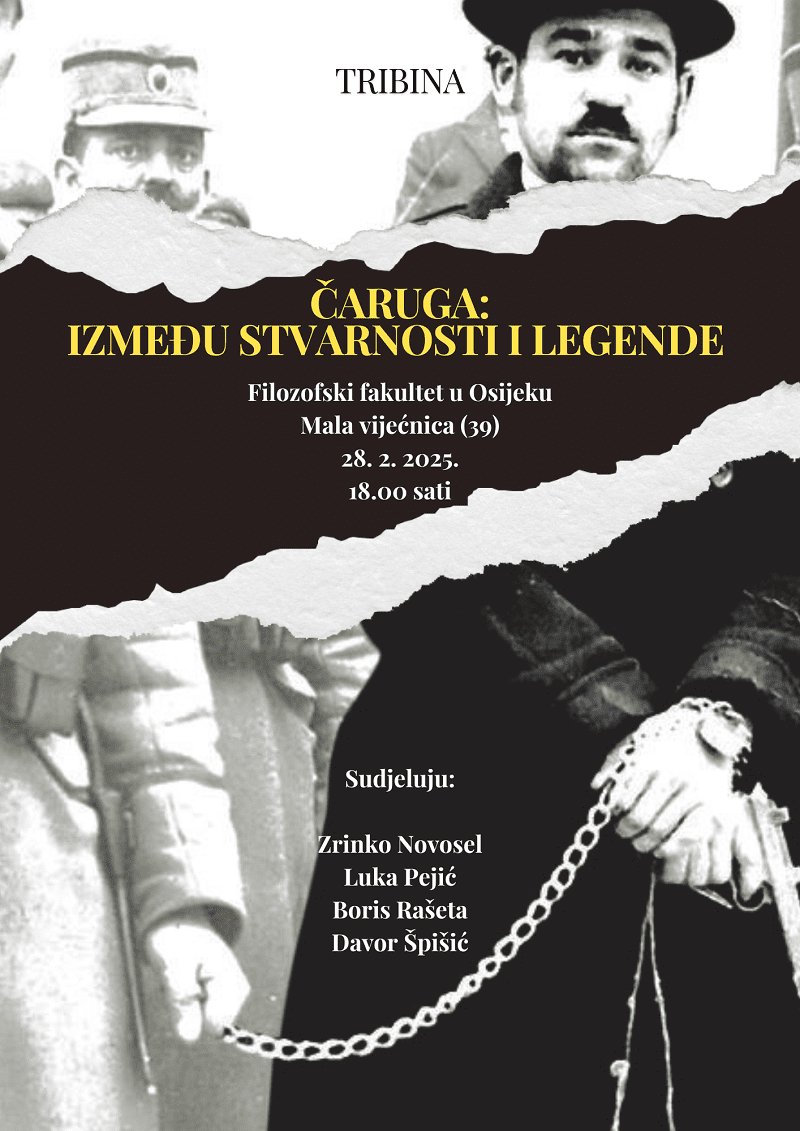 U petak, 28. veljače 2025. s početkom u 18 sati na Filozofskom fakultetu u Osijeku (Mala vijećnica, 39) održat će se tribina pod nazivom Čaruga: između stvarnosti i legende. Na tribini će sudjelovati povjesničari Zrinko Novosel i Luka Pejić, pisac Davor Špišić te novinar Boris Rašeta.