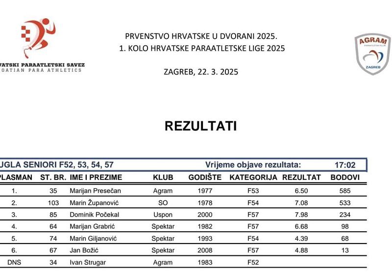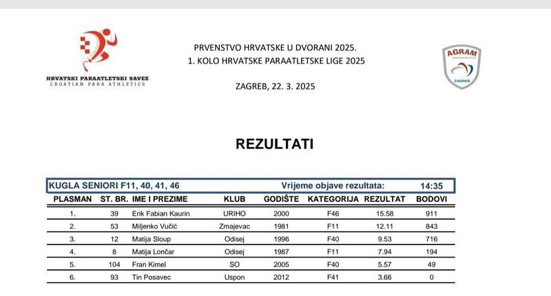 Proteklog vikenda održano je Prvenstvo Hrvatske u dvorani 2025. i prvo kolo Paraatletske lige, koje je u atletskoj dvorani okupilo najbolje hrvatske paraatletičare. Na natjecanju je sudjelovalo 128 sportaša iz 18 klubova, a među njima su nastupili i predstavnici Atletskog kluba Slavonija-Žito – Marin Županović i Fran Kimel.
