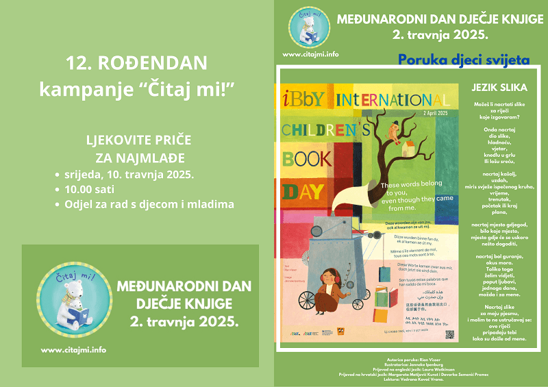 Odjel za rad s djecom i mladima Gradske i sveučilišne knjižnice Osijek i Fakultet za odgojne i obrazovne znanosti Osijek obilježavaju Međunarodni dan dječje knjige i 12. rođendan nacionalne kampanje za poticanje čitanja “Čitaj mi!”.