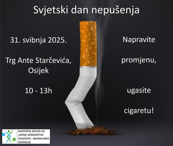U subotu, 31. svibnja 2025. godine Nastavni zavod za javno zdravstvo Osječko-baranjske županije u suradnji s Gradskom ligom protiv raka Osijek, Kliničkim bolničkim centrom Osijek, Domom zdravlja Osječko-baranjske županije, Medicinskom školom Osijek, Izviđačkim klubom Javor, CroMSIC-om – Međunarodnom udrugom studenata medicine Hrvatska te predstavnicima Grada Osijeka i Osječko-baranjske županije obilježit će Svjetski dan nepušenja na Trgu Ante Starčevića u vremenu od 10 do 13 sati.
