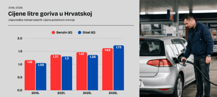 Početkom travnja 2026. litra dizela stoji 1,73 eura, a litra benzina 1,62 eura; takve cijene još nisu na razini rekordnih iz 2022. koje su bile potaknute ratom u Ukrajini, no građani bi svejedno mogli osjetiti razliku u svojem budžetu.